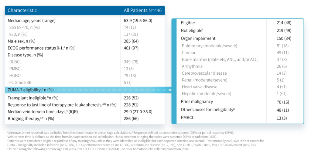 האוכלוסייה כללה 446 חולים עם DLBCL, HGBCL, FL דרגה 3B ו-PMBCL שטופלו ב-Yescarta כטיפול שני (2L) בין אפריל 2022 ליולי 2023 ב-89 מרכזים בארה”ב. הנתונים כללו גם חולים שפרופיל המטופל שלהם לא היה מתאים למחקר ה-Zuma -7 .