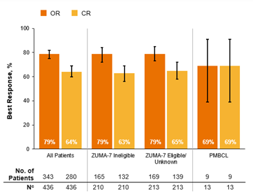 שיעורי התגובות האובייקטיביות (ORR) ותגובות מלאות (CR) היו עקביים בין כל קבוצות החולים. (איור 1) חציון הזמן לתגובה אובייקטיבית (median time to OR) היה 2.1 חודשים בסך הכל, עם 1.8 חודשים בקבוצת המטופלים שהפרופיל שלהם לא נכלל ב,ZUMA-7 2.4 חודשים בקבוצת המטופלים שהפרופיל שלהם כן נכלל ב/ZUMA-7 לא ידועים, ו-3.0 חודשים בקבוצת הPMBCL- . באופן דומה, הזמן החציוני לתגובה מלאה (CR) היה 3.1 חודשים בסך הכל, 3.2 חודשים בקבוצת המטופלים שהפרופיל שלהם לא נכלל ב,ZUMA-7 3.1חודשים בקבוצת המטופלים שהפרופיל שלהם כן נכלל ב/ZUMA-7 לא ידועים ו-3.0 חודשים בקבוצת הPMBCL.