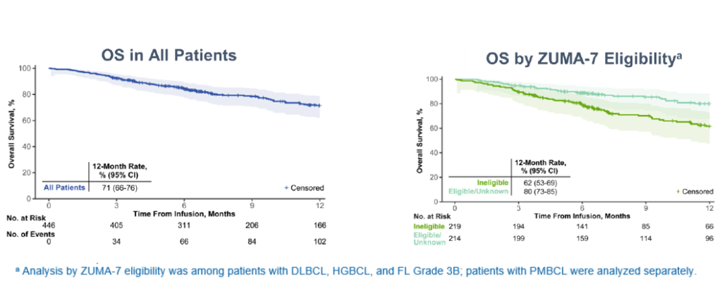 שיעור ההישרדות הכוללת (OS) ל-12 חודשים היה 71% בכל המטופלים, עם שיעורים של 62% בקבוצת המטופלים שהפרופיל שלהם לא נכלל ב ZUMA-7ו-80% בקבוצת המטופלים שהפרופיל שלהם כן נכלל ב/ZUMA-7 לא ידועים.